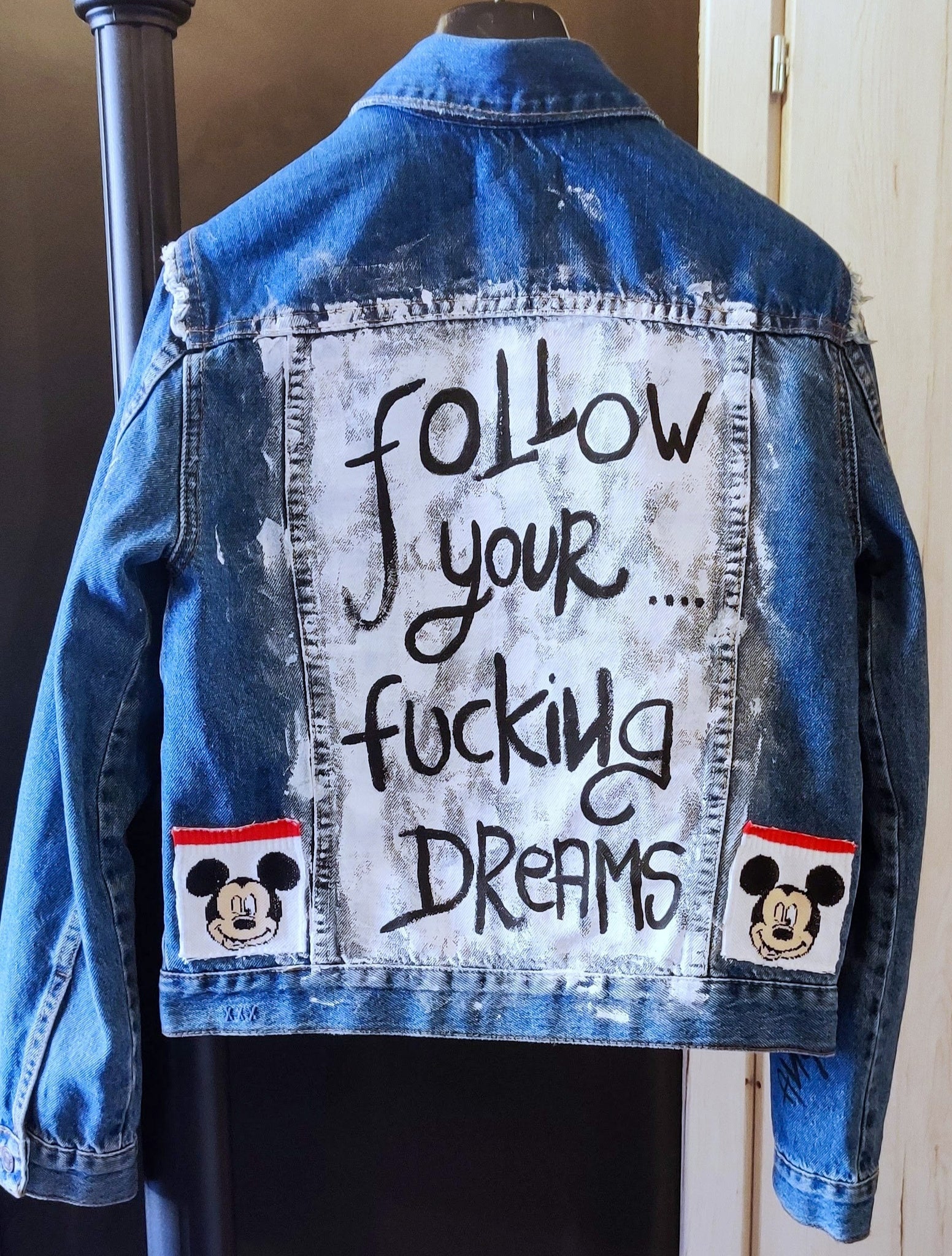 Giacca di jeans rivisitata custom con soggetti dell'iconico personaggio Disney, completamente dipinto a mano.